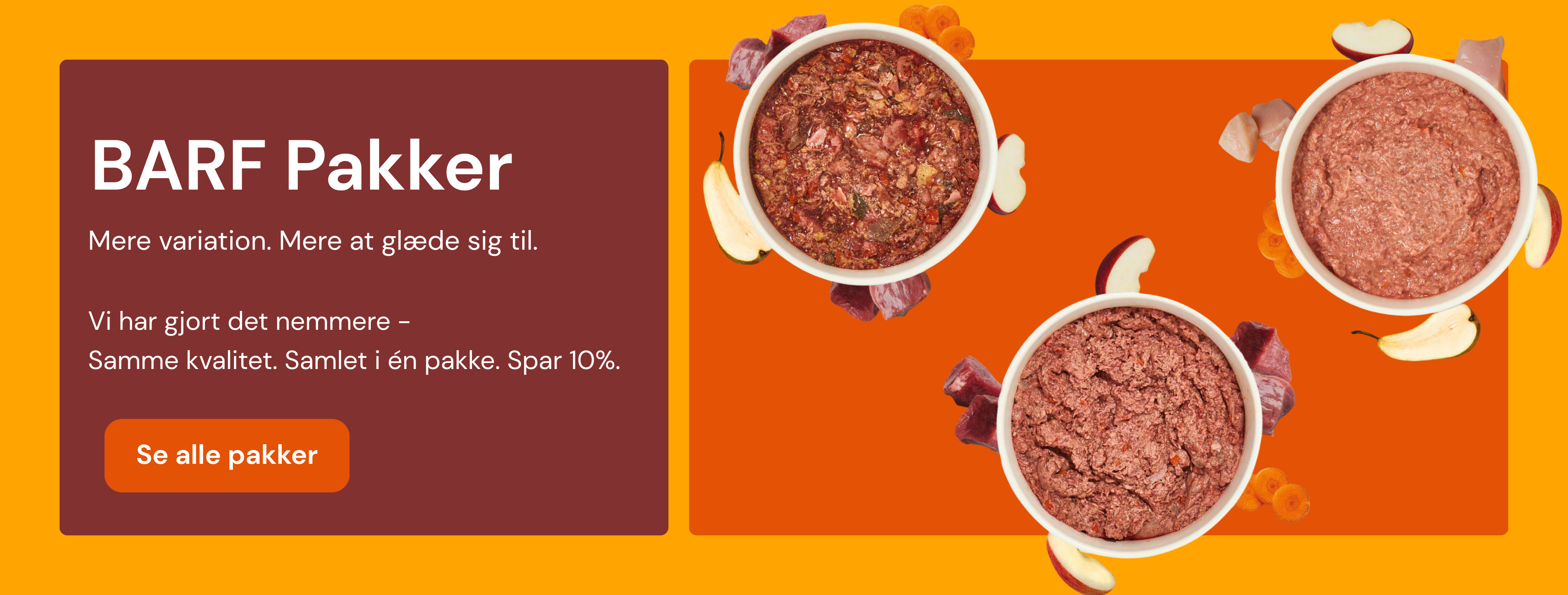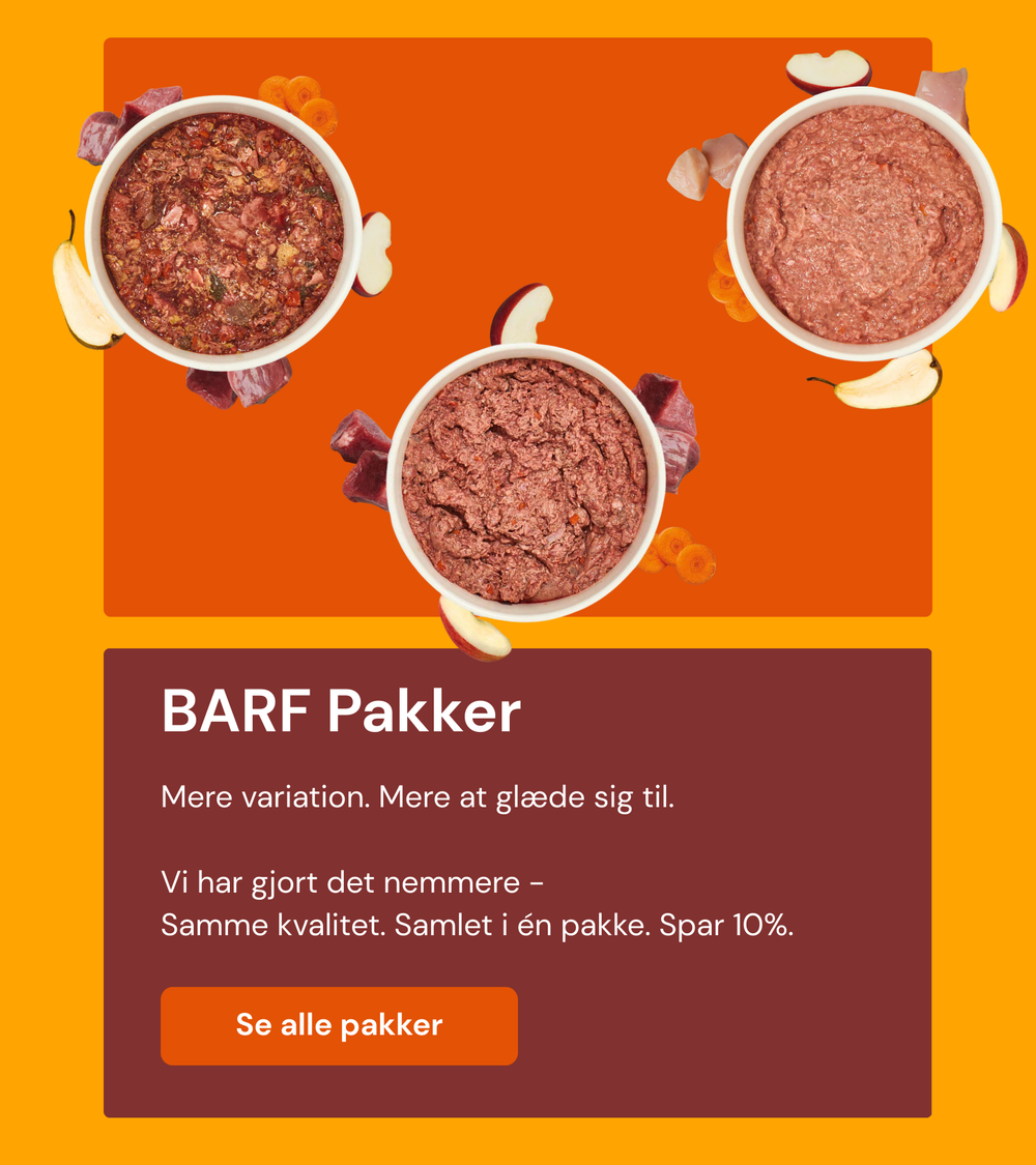 Et komplet BARF-måltid består at 80% animalske produkter og 20% vegetabilske. Under vores BARF-produkter kan du både finde komplette menuer og produkter hvor du selv kan sammen sætte dit BARF-måltid.
