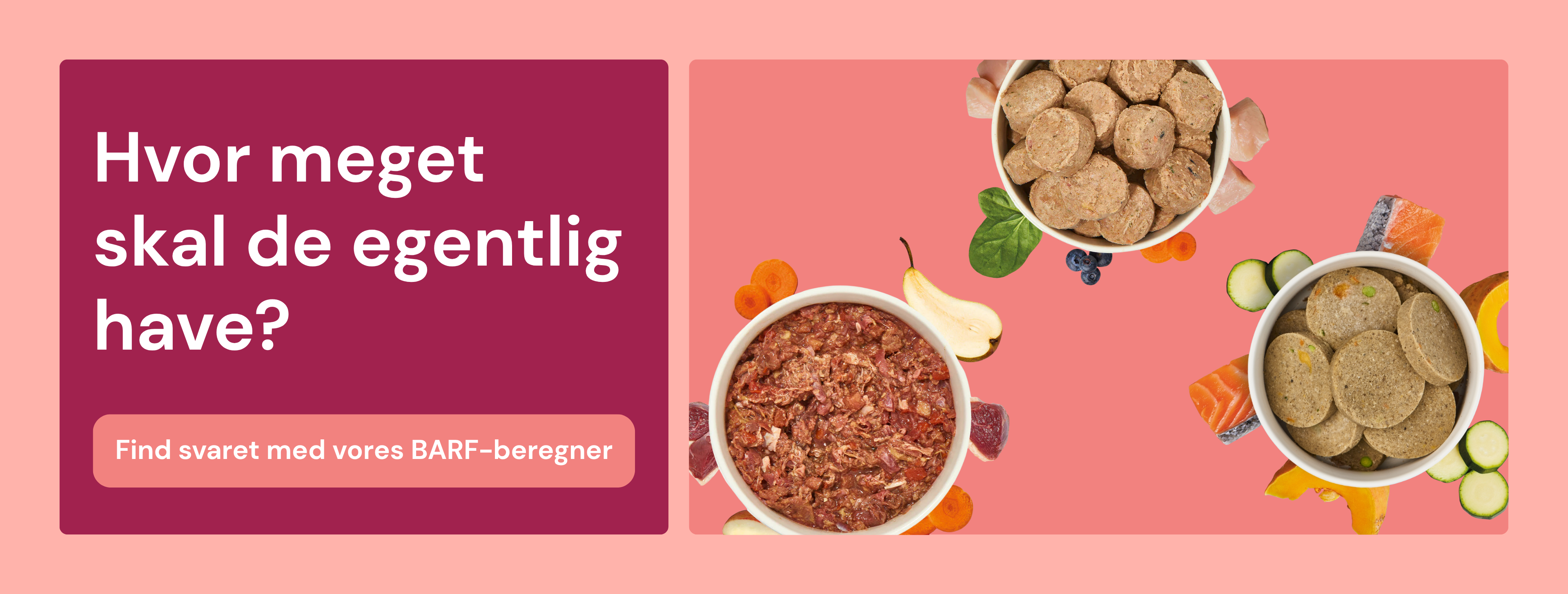Et komplet BARF-måltid består at 80% animalske produkter og 20% vegetabilske. Under vores BARF-produkter kan du både finde komplette menuer og produkter hvor du selv kan sammen sætte dit BARF-måltid.