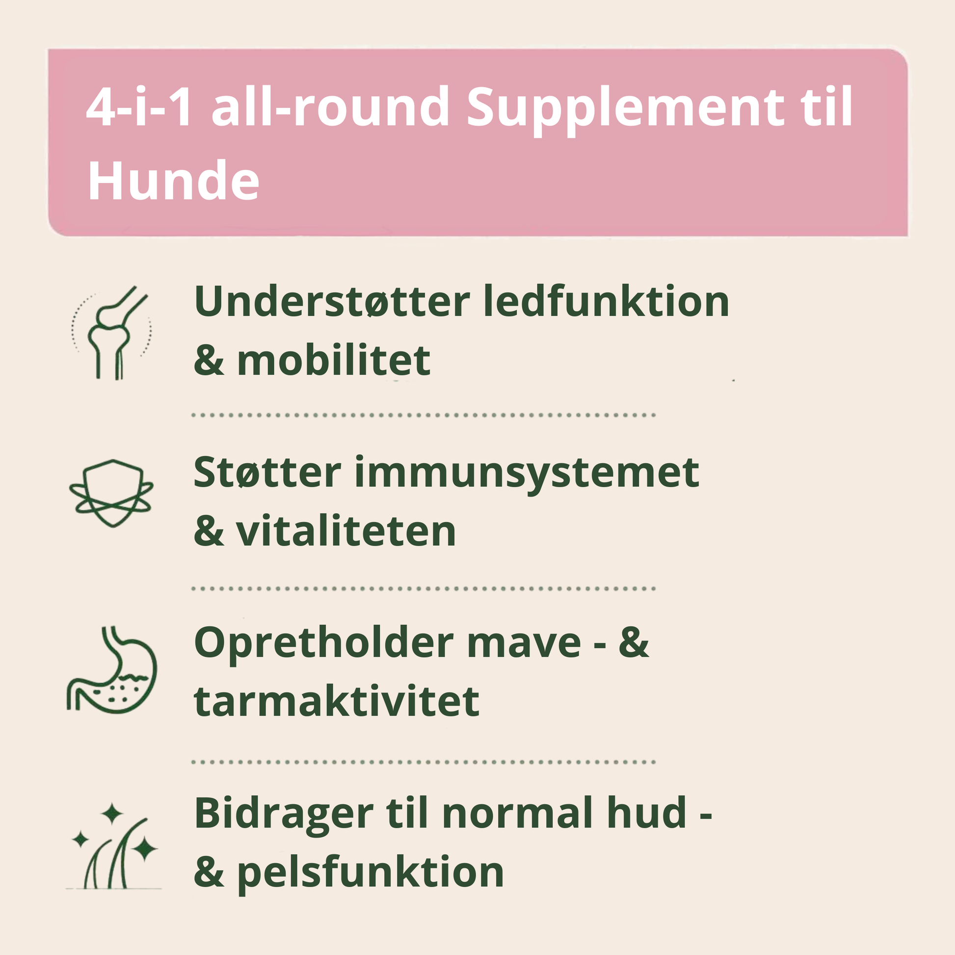 AniForte 4-i-1 Komplet Hund er et naturligt dagligt tilskud, der støtter din hunds trivsel på flere områder - samlet i ét produkt.