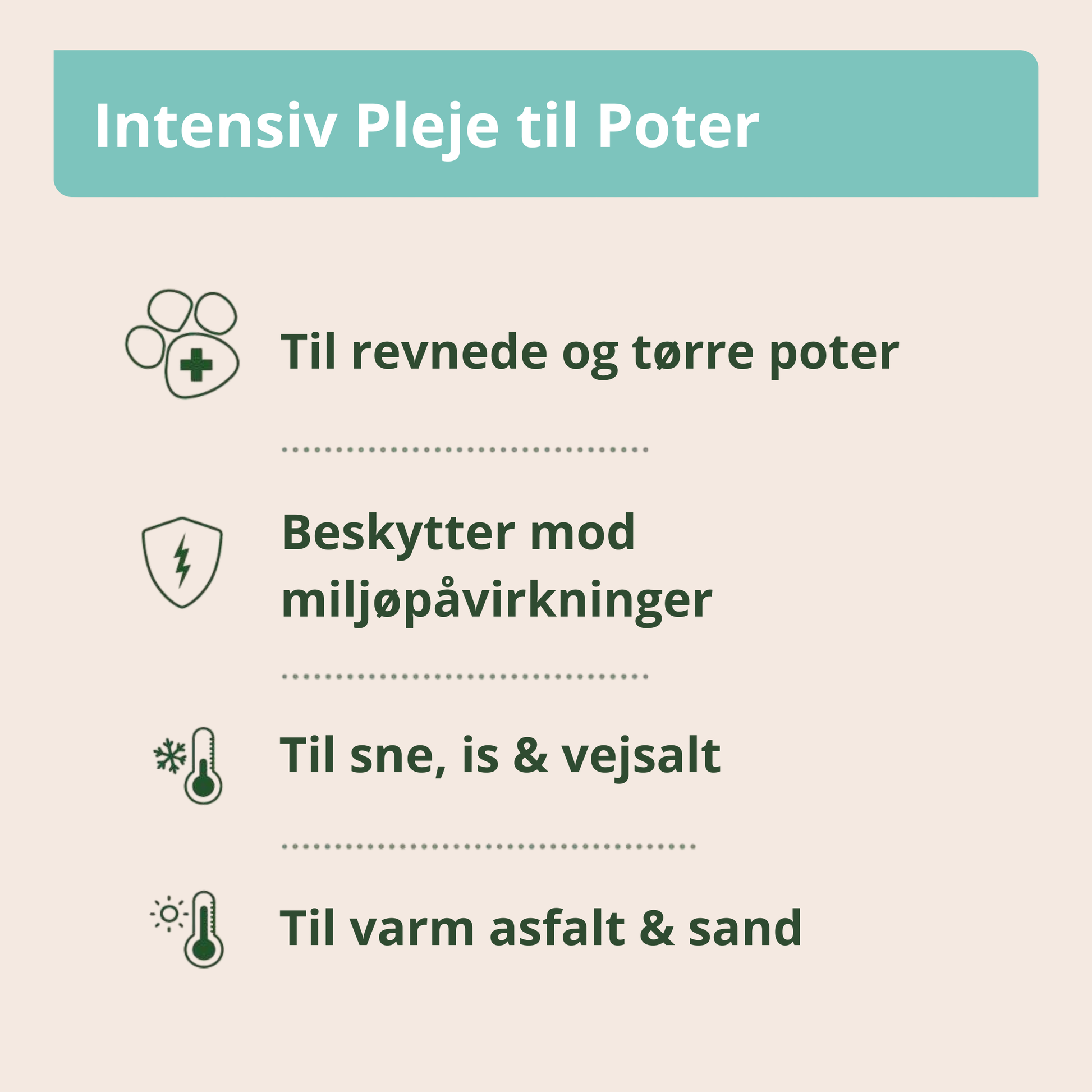 Velegnet både som daglig pleje og som ekstra beskyttelse i perioder med kulde, sne, vejsalt eller varmt underlag.