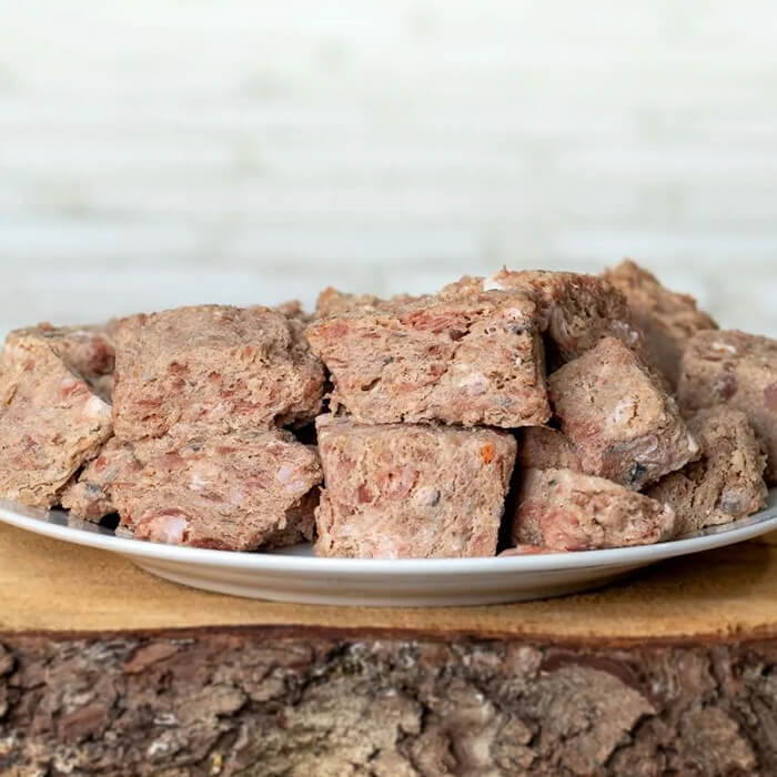 95% Kylling og Laks (30% Kyllingekød, 25% Laksehoved, 20% Kyllingekråser, 15% Kyllingehjerte, 5% Kyllingelever, 5% Grøntsagsmix (gulerod, Majroer, Selleri, Pastinak), 0,1% Kokos (Tørret) 0,1% Taurin.
