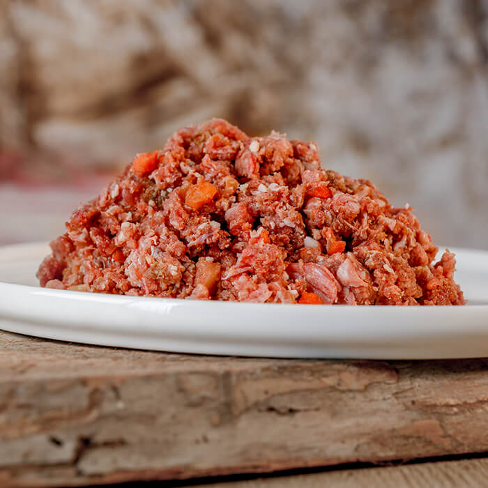 85% Lam (52% Muskelkød, 25% Grøn kallun, 34% Lever, 17% Hjerte, 16% Milt, 16% Lunge, 6%  Knogler)  15% Grøntsager & Frugt (15% Gulerod, 15% balanceret Broccoli, 14% Pastinak, 14% Zucchini, 14% Havrerod, 14% Æble, 14% Ribs) , Mineraler (revet kokosnød, Himalayasaltlage)