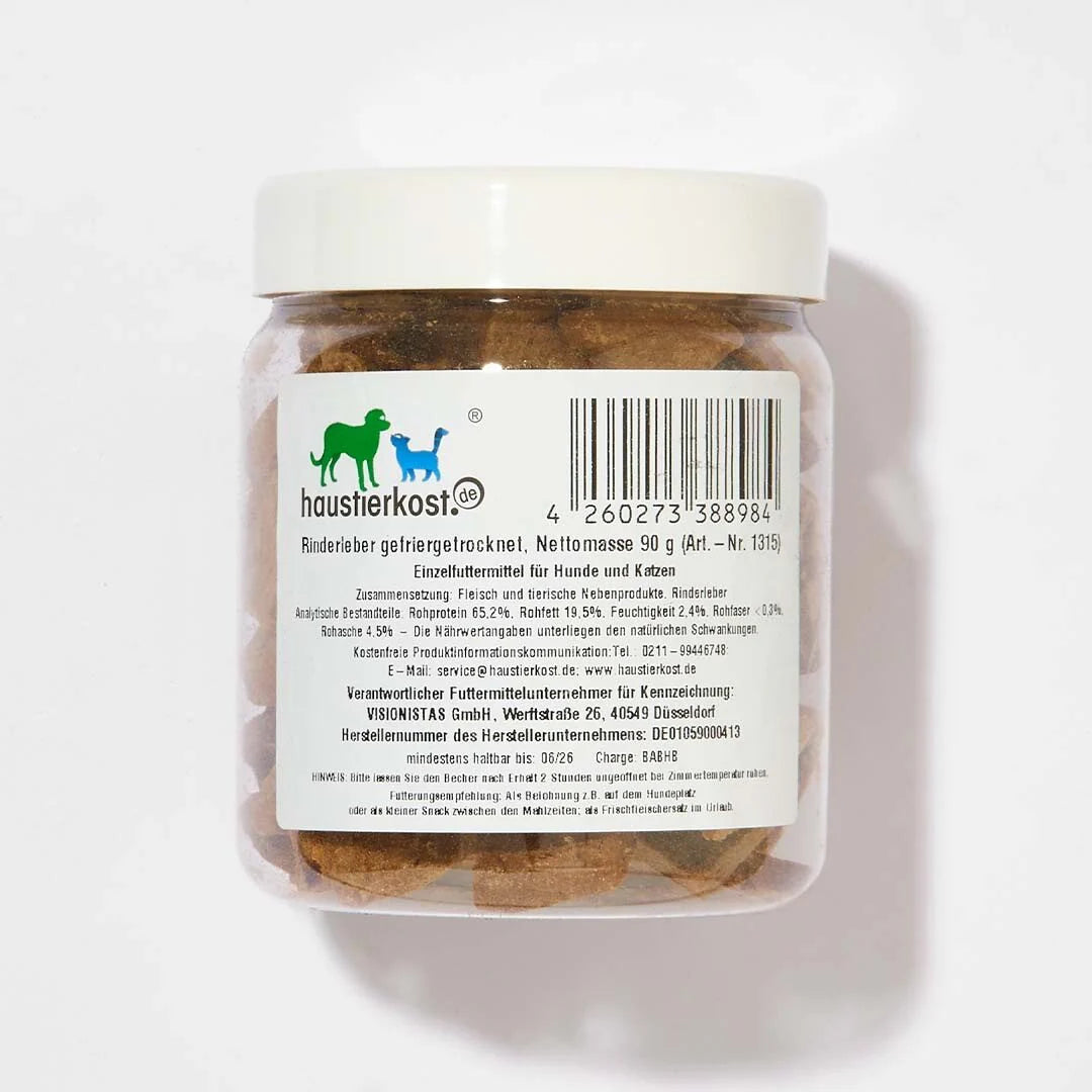 Haustierkost Frysetørret Okselever er en naturlig og smagfuld snack til både hunde og katte. Leverstykkerne er skånsomt frysetørret for at bevare næringsstoffer og smag – helt uden tilsætningsstoffer.