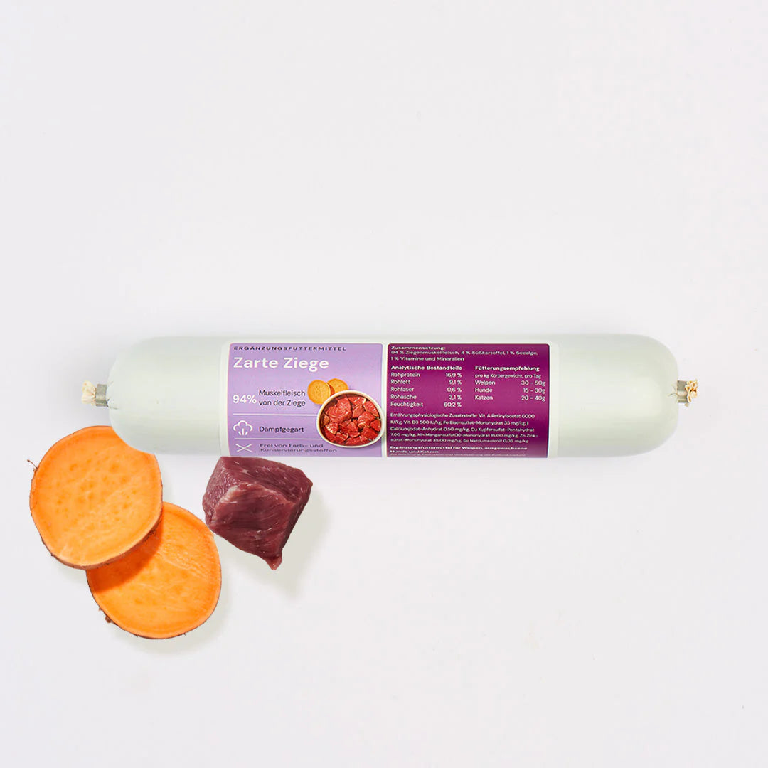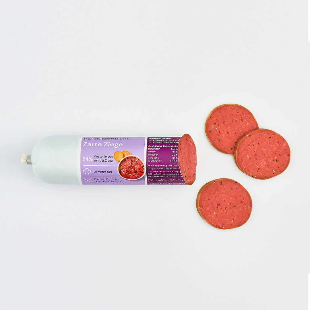 Haustierkost træningspølse af ged er en fast og velsmagende belønningssnack til både hunde og katte. Den er nem at skære i skiver eller små tern og er oplagt til træning, aktivering og som ekstra motivation på gåturen. Damptilberedt for at bevare smag og aroma – og uden farvestoffer og konserveringsmidler.